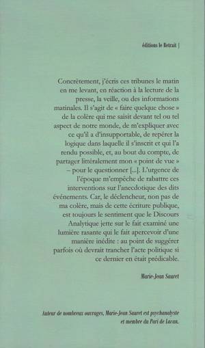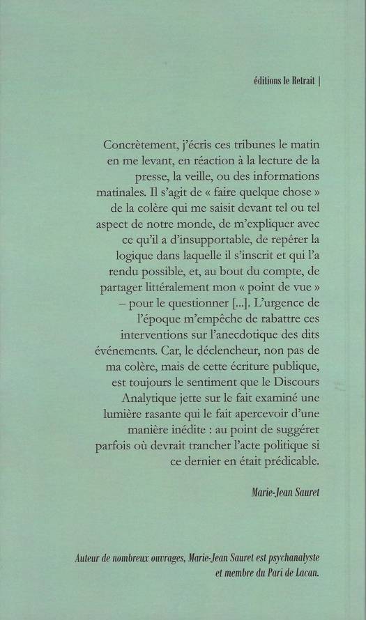 Concrètement, j’écris ces tribunes le matin en me levant, en réaction à la lecture de la presse, la veille, ou des informations matinales. Il s’agit de « faire quelque chose » de la colère qui me saisit devant tel ou tel aspect de notre monde, de m’expliquer avec ce qu’il a d’insupportable, de repérer la logique dans laquelle il s’inscrit et qui l’a rendu possible, et, au bout du compte, de partager littéralement mon « point de vue » – pour le questionner [...]. L’urgence de l’époque m’empêche de rabattre ces interventions sur l’anecdotique des dits événements. Car, le déclencheur, non pas de ma colère, mais de cette écriture publique, est toujours le sentiment que le Discours Analytique jette sur le fait examiné une lumière rasante qui le fait apercevoir d’une manière inédite : au point de suggérer parfois où devrait trancher l’acte politique si ce dernier en était prédicable.