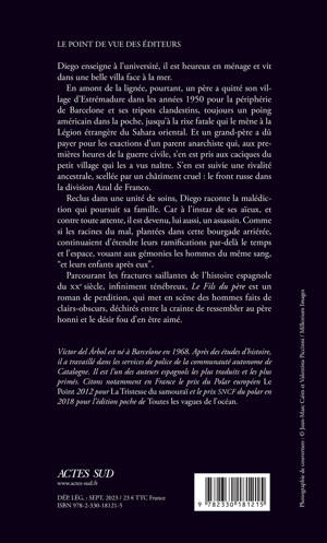 Diego enseigne à l'université, il est heureux en ménage et vit dans une belle villa face à la mer. En amont de la lignée, pourtant, un père a quitté son village d'Estrémadure dans les années 1950 pour la périphérie de Barcelone et ses tripots clandestins, toujours un poing américain dans la poche, jusqu'à la rixe fatale qui le mène à la Légion étrangère du Sahara oriental. Et un grand- père a dû payer pour les exactions d'un parent anarchiste qui, aux premières heures de la guerre civile, s'en est pris aux caciques du petit village qui les a vus naître. S'en est suivie une rivalité ancestrale, scellée par un châtiment cruel : le front russe dans la division Azul de Franco. Reclus dans une unité de soins, Diego raconte la malédiction qui poursuit sa famille. Car à l'instar de ses aïeux, et contre toute attente, il est devenu, lui aussi, un assassin. Comme si les racines du mal, plantées dans cette bourgade arriérée, continuaient d'étendre leurs ramifications par-delà le temps et l'espace, vouant aux gémonies les hommes du même sang, "et leurs enfants après eux". Parcourant les fractures saillantes de l'histoire espagnole du XX è siècle, infiniment ténébreux, Le Fils du père est un roman de perdition, qui met en scène des hommes faits de clairs-obscurs, déchirés entre la crainte de ressembler au père honni et le désir fou d'en être aimé.