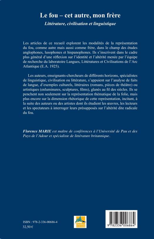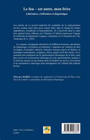 Les articles de ce recueil explorent les modalités de la représentation du fou, comme autre mais aussi comme frère, dans le champ des études anglophones, lusophones et hispanophones. Les auteurs, enseignants-chercheurs, spécialistes de linguistique, civilisation ou littérature, s’appuient sur l’analyse de faits de langue, d’exemples culturels, littéraires (romans, pièces de théâtre) ou artistiques (enluminures, sculptures, films), glanés au fil des siècles.