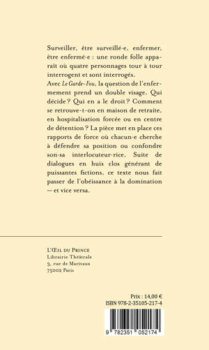 Avec Le Garde-Fou, la question de l'enfermement prend un double visage. Qui décide ? Qui en a le droit ? Comment se retrouve-t-on en maison de retraite, en hospitalisation forcée ou en centre de détention ? La pièce met en place ces rapports de force où chacun·e cherche à défendre sa position ou confondre son·sa interlocuteur·rice. Suite de dialogues en huis clos générant de puissantes fictions, ce texte nous fait passer de l'obéissance à la domination - et vice versa.