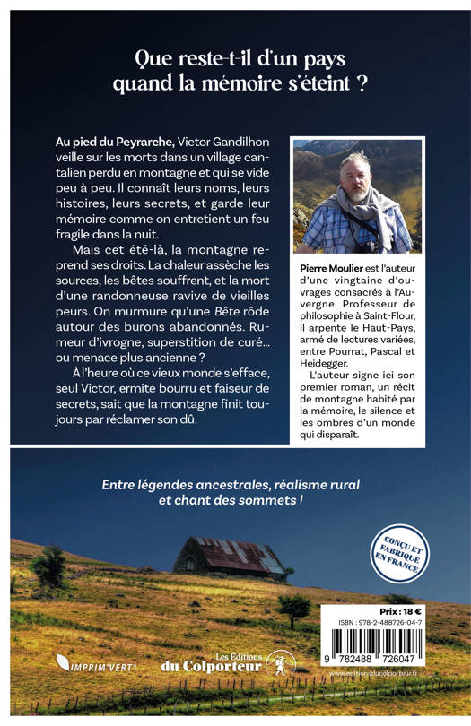 Que reste-t-il d’un pays quand la mémoire s’éteint ? Au pied du Peyrarche, Victor Gandilhon veille sur les morts dans un village cantalien perdu en montagne et qui se vide peu à peu. Il connaît leurs noms, leurs histoires, leurs secrets, et garde leur mémoire comme on entretient un feu fragile dans la nuit. Mais cet été-là, la montagne reprend ses droits. La chaleur assèche les sources, les bêtes souffrent, et la mort d’une randonneuse ravive de vieilles peurs. On murmure qu’une Bête rôde autour des burons abandonnés. Rumeur d’ivrogne, superstition de curé… ou menace plus ancienne ? À l’heure où ce vieux monde s’efface, seul Victor, ermite bourru et faiseur de secrets, sait que la montagne finit toujours par réclamer son dû. Entre légendes ancestrales, réalisme rural et chant des sommets !