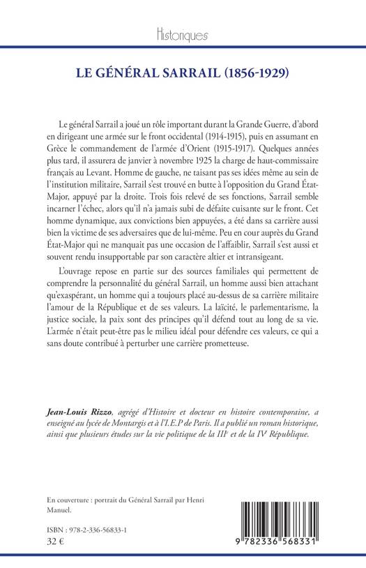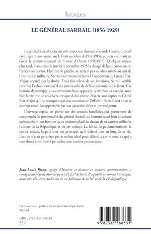 Le général Sarrail a joué un rôle important durant la Grande Guerre, d'abord en dirigeant une armée sur le front occidental (1914-1915), puis en assumant en Grèce le commandement de l'armée d'Orient (1915-1917). Quelques années plus tard, il assurera de janvier à novembre 1925 la charge de haut-commissaire français au Levant. Homme de gauche, ne taisant pas ses idées même au sein de l'institution militaire, Sarrail s'est trouvé en butte à l'opposition du Grand État-Major, appuyé par la droite. Trois fois relevé de ses fonctions, Sarrail semble incarner l'échec, alors qu'il n'a jamais subi de défaite cuisante sur le front. Cet homme dynamique, aux convictions bien appuyées, a été dans sa carrière aussi bien la victime de ses adversaires que de lui-même. Peu en cour auprès du Grand État-Major qui ne manquait pas une occasion de l'affaiblir, Sarrail s'est aussi et souvent rendu insupportable par son caractère altier et intransigeant. L'ouvrage repose en partie sur des sources familiales qui permettent de comprendre la personnalité du général Sarrail, un homme aussi bien attachant qu'exaspérant, un homme qui a toujours placé au-dessus de sa carrière militaire l'amour de la République et de ses valeurs. La laïcité, le parlementarisme, la justice sociale, la paix sont des principes qu'il défend tout au long de sa vie. L'armée n'était peut-être pas le milieu idéal pour défendre ces valeurs, ce qui a sans doute contribué à perturber une carrière prometteuse.