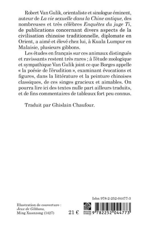 Robert Van Gulik, orientaliste et sinologue eminent, auteur de La vie sexuelle dans la Chine antique, des nombreuses et tres celebres Enquetes du juge Ti, de publications concernant divers aspects de la civilisation chinoise traditionnelle, diplomate en Orient, a aime et eleve chez lui, a Kuala Lumpur en Malaisie, plusieurs gibbons. Les etudes en francais sur ces animaux distingues et ravissants restent tres rares; a l'etude zoologique et sympathique Van Gulik joint ce que Borges appelle la poesie de l'erudition , examinant evocations et figures, dans la litterature et la peinture chinoises classiques, de ces singes gracieux et aimables. On pourra lire ici des textes nulle part ailleurs traduits, et de fins commentaires de tableaux fort peu connus.