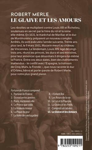 Les révoltes se multiplient contre Louis XIII et Richelieu, soutenues en secret par le frère du roi et la reine elle-mème. En 1631, le maréchal de Marillac et le duc de Montmorency préparent un nouveau complot. Arrètés, ils sont exécutés l'année suivante. Trente ans plus tard, le 9 mars 1661, Mazarin meurt au château de Vincennes. Le lendemain, Louis XIV, âgé de vingt-trois ans, réunit les princes, les ducs et ses ministres, pour leur annoncer que désormais il dirigera lui-mème la France. Entre ces deux dates, bien des événements inattendus - le conflit avec l'Espagne, la trahison de Cinq-Mars, la Fronde -, que nous raconte le duc d'Orbieu, héros et porte-parole de Robert Merle, pour notre plus grand plaisir. Fortune de France comprend: 1. Fortune de France - 2. En nos vertes années - 3. Paris, ma bonne ville - 4. Le Prince que voilà - 5. La Violente Amour - 6. La Pique du jour - 7. La Volte des vertugadins - 8. L'Enfant-Roi - 9. Les Roses de la vie - 10. Le Lys et la Pourpre - 11. La Gloire et les Périls - 12. Complots et cabales - 13. Le Glaive et les Amours