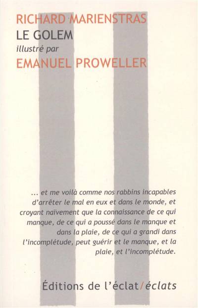Peut-on devenir Golem ?, semble se demander le protagoniste de ce court récit de Richard Marienstras paru en 1955. La nouvelle inscrit cette figure de la mythologie juive dans une aventure contemporaine et magique qui met en scène l'auteur malade et un personnage farfelu venu lui commander une traduction du yiddish. Être incomplet, le Golem que rien ne distingue de l'humain, laisse à penser que la connaissance de cette incomplétude guérit de l'incomplétude. Les dessins abstraits d'Emanuel Proweller, qui accompagnent le récit et tendent lentement au noir, confirment qu'il n'en est rien.