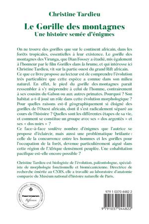 Ce que ce livre propose au lecteur est de comprendre l’évolution très particulière que cette espèce a connue dans son milieu naturel. En effet, le pied du gorille des montagnes parait ressembler à s’y méprendre à celui de l'homme, contrairement à ses cousins du Gabon ou aux autres primates. Pourquoi ? Son habitat a-t-il joué un rôle dans cette évolution morphologique ? Pour quelles raisons est-il géographiquement si éloigné des gorilles de l’Ouest africain, dont il s’est radicalement séparé au cours de l’histoire ? Quelles sont les différentes étapes de sa vie, et comment se constitue un groupe avec ses « dos argentés » et ses « dos noirs » ?