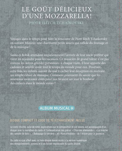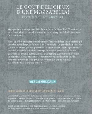 Voyagez dans le temps pour faire la rencontre de Piotr Ilitch Tchaïkovski en suivant Minime, une charmante petite souris qui raffole du fromage et de la musique ! Sasha et Bobik attendent impatiemment l'arrivée de leur oncle préféré qui vient les rejoindre pour les vacances. Ce musicien de grand talent n'est pas comme les autres grandes personnes: à chaque visite, il leur apporte des cadeaux et semble avoir tout le temps du monde pour eux. Pourtant, cette fois, les enfants auront du mal à cacher leur déception en recevant un simple cahier de musique. Comment pouvaient-ils savoir que les nouveaux morceaux créés pour eux par Piotr Ilitch Tchaïkovski feraient un jour le bonheur des enfants dans le monde entier ? Le conte narré, suivi de quelques notes biographiques, intègre les enregistrements Chanson allemande, Chanson napolitaine, La marche des soldats de bois, Babayaga la sorcière et Kamarinskaya de l'album pour la jeunesse. Un code unique pour le téléchargement des enregistrements est également inclus. Travel through time following a charming little mouse called Minim who loves cheese and music. Join him on his vacation adventure in the country with Sasha and Bobik as they spend time with their favourite uncle, none other than Pyotr Ilyitch Tchaikovsky. This summer, the brilliant composer has offered them a gift they didn't expect, one that will last forever and bring happiness to children all over the world! In addition to an illustrated story and introductory notes on the composer in French, this book is accompanied by a CD featuring recordings of the narrated story and the performances of the compositions "German Song," "March of the Wooden Soldiers," "Babayaga," "The Witch Baba Yaga," and "Kamarinskaya" from "Album for the Young." A unique code for the digital download of the recordings and a printable file of the illustrated story is also included.