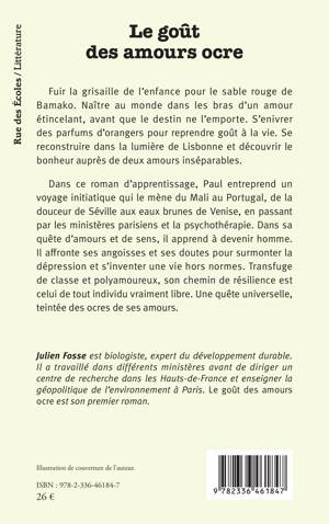 Fuir la grisaille de l'enfance pour le sable rouge de Bamako. Naître au monde dans les bras d'un amour étincelant, avant que le destin ne l'emporte. S'enivrer des parfums d'orangers pour reprendre goût à la vie. Se reconstruire dans la lumière de Lisbonne et découvrir le bonheur auprès de deux amours inséparables. Dans ce roman d'apprentissage, Paul entreprend un voyage initiatique qui le mène du Mali au Portugal, de la douceur de Séville aux eaux brunes de Venise, en passant par les ministères parisiens et la psychothérapie. Dans sa quête d'amours et de sens, il apprend à devenir homme. Il affronte ses angoisses et ses doutes pour surmonter la dépression et s'inventer une vie hors normes. Transfuge de classe et polyamoureux, son chemin de résilience est celui de tout individu vraiment libre. Une quête universelle, teintée des ocres de ses amours.