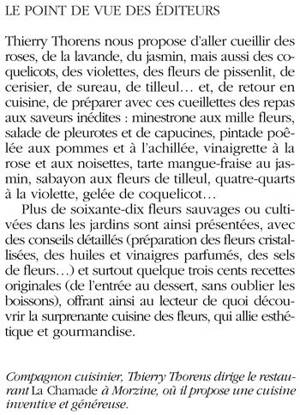 Thierry Thorens nous propose d'aller cueillir des roses, de la lavande, du jasmin, mais aussi des coquelicots, des violettes, des fleurs de pissenlit, de cerisier, de sureau, de tilleul... et, de retour en cuisine, de préparer avec ces cueillettes des repas aux saveurs inédites : minestrone aux mille fleurs, salade de pleurotes et de capucines, pintade poêlée aux pommes et à l'achillée, vinaigrette à la rose et aux noisettes, tarte mangue-fraise au jasmin, sabayon aux fleurs de tilleul, quatre-quarts à la violette, gelée de coquelicot... Plus de soixante-dix fleurs sauvages ou cultivées dans les jardins sont ainsi présentées, avec des conseils détaillés (préparation des fleurs cristallisées, des huiles et vinaigres parfumés, des sels de fleurs...) et surtout quelque trois cents recettes originales (de l'entrée au dessert, sans oublier les boissons), offrant ainsi au lecteur de quoi découvrir la surprenante cuisine des fleurs, qui allie esthétique et gourmandise. « Compagnon cuisinier, Thierry Thorens dirige le restaurant La Chamade à Morzine, où il propose une cuisine inventive et généreuse.»