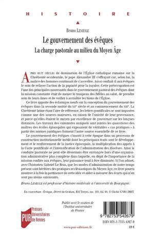Ce livre apporte des éclairages neufs sur la conception du gouvernement des évêques dans la seconde moitié du XIIe siècle et au commencement du XIIIe. La Chrétienté latine étant l’aire de référence, les lettres pontificales se sont imposées comme une des sources majeures, en raison de l’unicité de leur provenance, et parce qu’elles étaient le moyen par excellence de gouverner sur les longues distances. Les travaux des canonistes auxquels sont jointes les quaestiones des maîtres des écoles épiscopales qui exposaient de véritables « cas pratiques » à partir des normes juridiques forment l’autre source essentielle de ce livre.