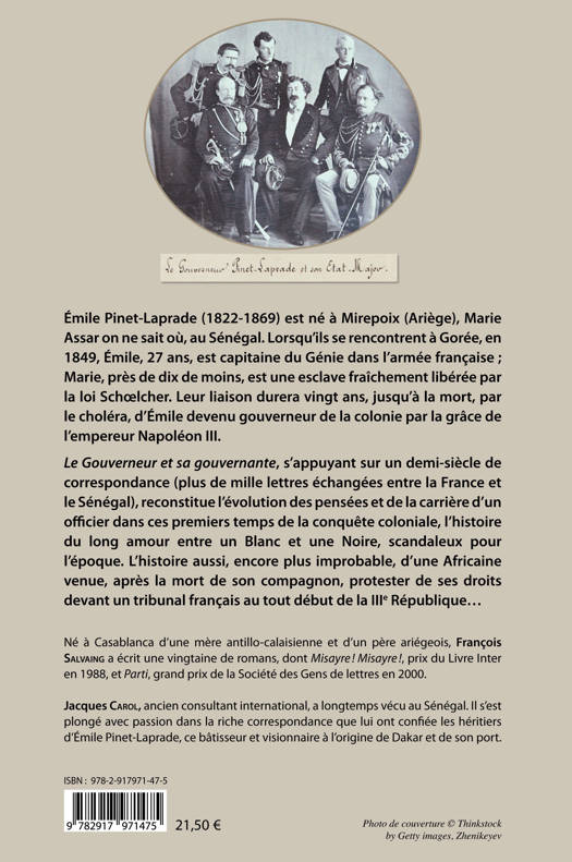 Émile Pinet-Laprade (1822-1869) est né à Mirepoix (Ariège), Marie Assar on ne sait où, au Sénégal. Lorsqu'ils se rencontrent à Gorée, en 1849, Émile, 27 ans, est capitaine du Génie dans l'armée française ; Marie, près de dix de moins, est une esclave fraîchement libérée par la loi Schoelcher. Leur liaison durera vingt ans, jusqu'à la mort, par le choléra, d'Émile devenu gouverneur de la colonie par la grâce de l'empereur Napoléon III.
