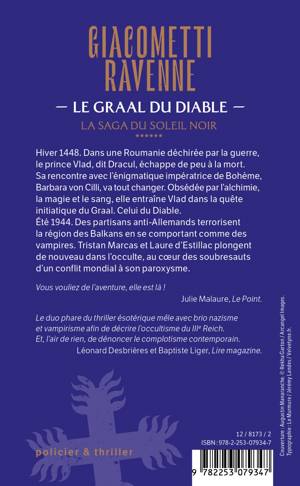 Hiver 1448. Dans une Roumanie déchirée par la guerre, le prince Vlad, dit Dracul, échappe de peu à la mort. Sa rencontre l’énigmatique impératrice de Bohème, Barbara von Cilli, va tout changer. Obsédée par l’alchimie, la magie et le sang, elle entraîne Vlad dans la quête initiatique du Graal. Celui du Diable. Été 1944. Des partisans anti-allemands terrorisent la région des Balkans, se comportant comme des vampires. Tristan Marcas et Laure d’Estillac plongent de nouveau dans l’occulte, au cœur des soubresauts d’un conflit mondial à son paroxysme.