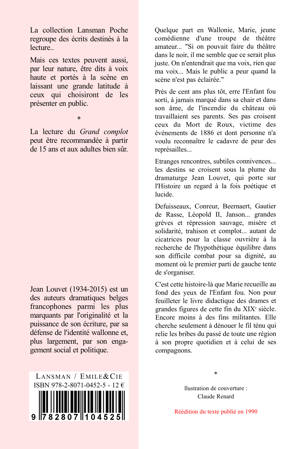 Quelque part en Wallonie, Marie, jeune comédienne d'une troupe de théâtre amateur… "Si on pouvait faire du théâtre dans le noir, il me semble que ce serait plus juste. On n'entendrait que ma voix, rien que ma voix… Mais le public a peur quand la scène n'est pas éclairée." Près de cent ans plus tôt, erre l'Enfant fou sorti, à jamais marqué dans sa chair et dans son âme, de l'incendie du château où travaillaient ses parents. Ses pas croisent ceux du Mort de Roux, victime des événements de 1886 et dont personne n'a voulu reconnaître le cadavre de peur de représailles… Etranges rencontres, subtiles connivences… les destins se croisent sous la plume du dramaturge Jean Louvet, qui porte sur l'Histoire un regard à la fois poétique et lucide. Defuisseaux, Conreur, Beernaert, Gautier de Rasse, Léopold II, Janson… grandes grèves et répression sauvage, misère et solidarité, trahison et complot… autant de cicatrices pour la classe ouvrière à la recherche de l'hypothétique équilibre dans son difficile combat pour sa dignité, au moment où le premier parti de gauche tente de s'organiser. C'est cette histoire-là que Marie recueille au fond des yeux de l'Enfant fou. Non pour feuilleter le livre didactique des drames et grandes figures de cette fin du XIXe siècle. Encore moins à des fins militantes. Elle cherche seulement à dénouer le fil ténu qui relie les bribes du passé de toute une région à son propre quotidien et à celui de ses compagnons.