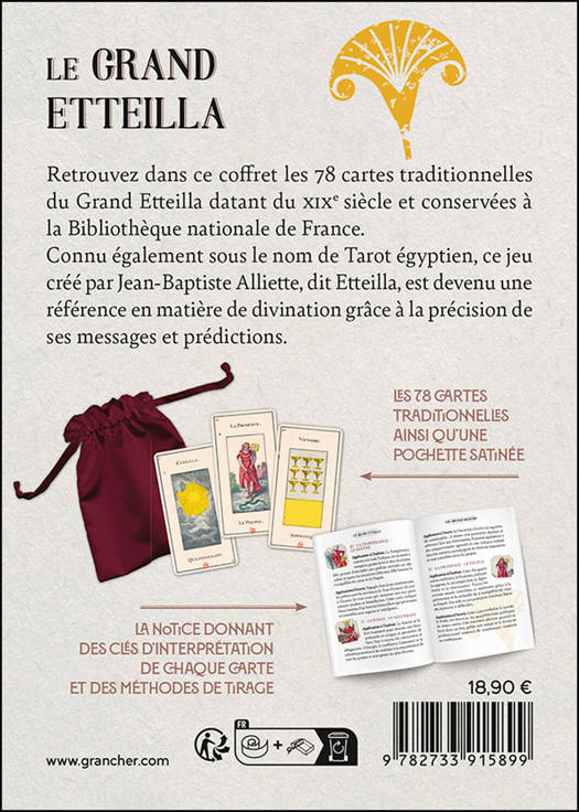 Retrouvez dans ce coffret les 78 cartes traditionnelles du Grand Etteilla datant du XIXe siècle et conservées à la Bibliothèque nationale de France.Connu également sous le nom de Tarot égyptien, ce jeu créé par Jean-Baptiste Alliette, dit Etteilla, est devenu une référence en matière de divination grâce à la précision de ses messages et prédictions. La notice donne des clés d’interprétation de chaque carte et des méthodes de tirage.