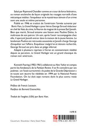 Salue par Raymond Chandler comme un tour de force litteraire , ce roman enclenche de facon originale les rouages narratifs d'une mecanique inedite: l'enqueteur et le mysterieux temoin d'un crime sont une seule et meme personne. Publie en 1946 et traduit de l'americain l'annee suivante par Boris Vian, Le Grand Horloger a pour heros George Stroud redacteur en chef de Voies du crime, le fleuron du magnat de la presse Earl Janoth. Bien que marie, Stroud entame une liaison avec Pauline Delos, la maitresse de son patron. Un soir, apres l'avoir raccompagnee chez elle, il apercoit Janoth entrer dans la maison de la jeune femme. Le lendemain Pauline est retrouvee assassinee et Janoth charge George d'enqueter sur l'affaire. Enqueteur malgre lui et temoin recherche, George Stroud est pris dans un piege infernal. Adapte a plusieurs reprises a l'ecran et constamment reedite depuis sa parution, Le Grand Horloger est un grand classique du roman noir americain.