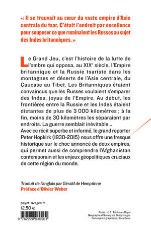 Le Grand Jeu, c'est l'histoire de la lutte de l'ombre qui opposa, au XIXe siècle, l'Empire britannique et la Russie tsariste dans les montagnes et déserts de l'Asie centrale, du Caucase au Tibet. Les Britanniques étaient convaincus que les Russes voulaient s'emparer des Indes, joyau de l'Empire. Au début, les frontières entre la Russie et les Indes étaient distantes de plus de 3 000 kilomètres ; à la fin, moins de 30 kilomètres les séparaient par endroits. La guerre semblait inévitable... Avec ce récit superbe et informé, le grand reporter Peter Hopkirk (1930-2015) nous offre une fresque historique sur le choc annoncé de deux empires, qui permet aussi de comprendre l'Afghanistan contemporain et les enjeux géopolitiques cruciaux de cette région du monde.