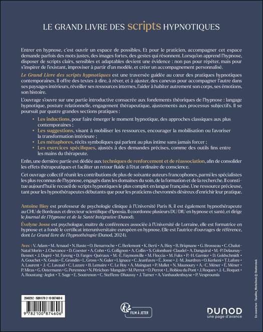 Le Grand Livre des scripts hypnotiques est une traversée guidée au coeur des pratiques hypnotiques contemporaines. Il offre des textes à dire, à rêver, et à ajuster, des canevas pour accompagner l’autre dans ses paysages intérieurs, réveiller ses ressources internes, l’aider à habiter autrement son corps, ses émotions, son histoire.