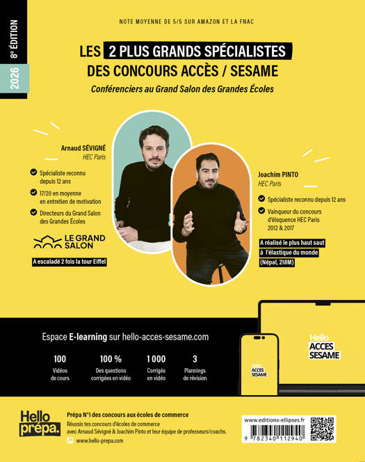 Joachim PINTO (HEC Paris) et Arnaud SÉVIGNÉ (HEC Paris) sont les 2 plus grands spécialistes des concours ACCES/SESAME. Conférenciers du concours SESAME dans plusieurs Grandes Ecoles (emlyon, SKEMA, etc.) et speakers au Grand Salon des Grandes Ecoles, ils ont préparé des milliers de candidats aux concours ACCES et SESAME. Enfin, ils sont les directeurs de l’institut de préparation aux concours de référence Hello Prépa : www.hello-prepa.com