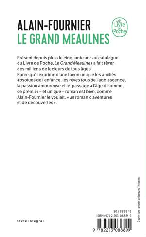 Présent depuis près de cinquante ans au catalogue du Livre de Poche – avec le numéro 1000 –, Le Grand Meaulnes a fait rêver plus de cinq millions de lecteurs de tous âges. Parce qu’il exprime d’une façon unique les amitiés absolues de l’enfance, les rêves fous de l’adolescence, la passion amoureuse et le passage à l’âge d’homme, ce premier – et unique – roman est bien, comme Alain- Fournier le voulait, « un roman d’aventures et de découvertes ».