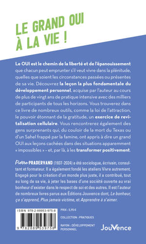 Le OUI est le chemin de la liberté et de l’épanouissement que chacun peut emprunter s’il veut vivre dans la plénitude, quelles que soient les circonstances passées ou présentes de sa vie. Découvrez la leçon la plus fondamentale du développement personnel, acquise par l’auteur au cours de plus de vingt ans de pratique intensive avec des milliers de participants de tous les horizons. Vous trouverez dans ce livre de nombreux outils, comme la loi de l’attraction, le pouvoir étonnant de la gratitude, un exercice de revitalisation cellulaire. Vous rencontrerez également des gens surprenants qui, du couloir de la mort du Texas ou d’un Sahel frappé par la famine, ont appris à dire un grand OUI aux leçons cachées dans des situations apparemment « impossibles » – et, par là, à les transformer positivement.