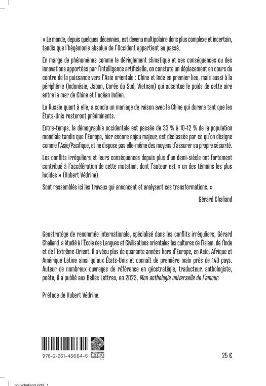 " Le monde, depuis quelques decennies, est devenu multipolaire donc plus complexe et incertain, tandis que l'hegemonie absolue de l'Occident appartient au passe. En marge de phenomenes comme le dereglement climatique et ses consequences ou des innovations apportees par l'intelligence artificielle, on constate un deplacement en cours du centre de la puissance vers l'Asie orientale: Chine et Inde en premier lieu, mais aussi a la peripherie (Indonesie, Japon, Coree du Sud, Vietnam) qui accentue le poids de cette aire entre la mer de Chine et l'ocean Indien. La Russie quant a elle, a conclu un mariage de raison avec la Chine qui durera tant que les Etats-Unis resteront preeminents. Entre-temps, la demographie occidentale est passee de 33 % a 10-12 % de la population mondiale tandis que l'Europe, hier encore enjeu majeur, est declassee par ce qu'on designe comme l'Asie/Pacifique, et ne dispose pas elle-meme des moyens d'assurer sa propre securite. Les conflits irreguliers et leurs consequences depuis plus d'un demi-siecle ont fortement contribue a l'acceleration de cette mutation, dont l'auteur est " un des temoins les plus lucides " (Hubert Vedrine). Sont rassembles ici les travaux qui annoncent et analysent ces transformations. "