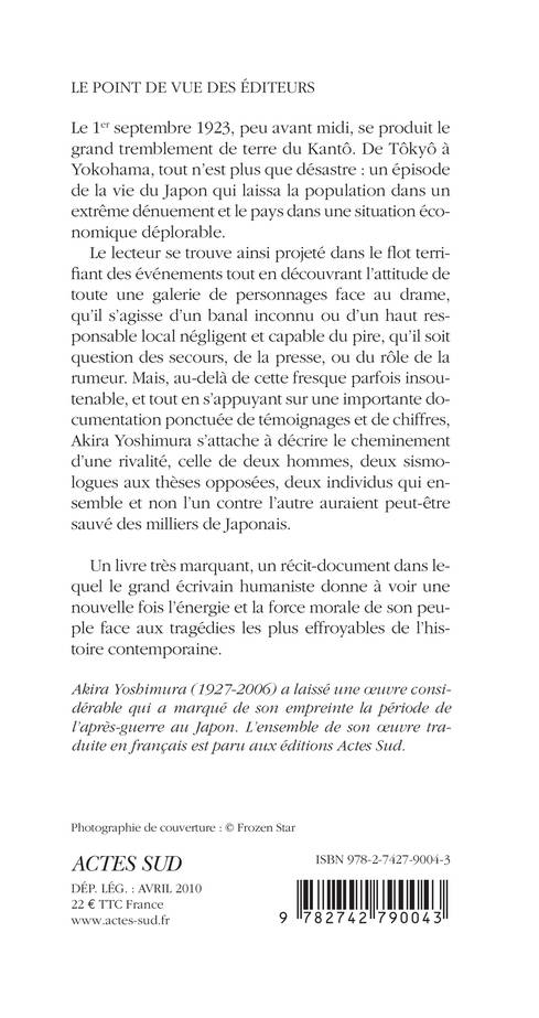 Le 1er septembre 1923, peu avant midi, se produit le grand tremblement de terre du Kantô. De Tôkyô à Yokohama, tout n'est plus que désastre : un épisode de la vie du Japon qui laissa la population dans un extrême dénuement et le pays dans une situation économique déplorable. Le lecteur se trouve ainsi projeté dans le flot terrifiant des événements tout en découvrant l'attitude de toute une galerie de personnages face au drame, qu'il s'agisse d'un banal inconnu ou d'un haut responsable local négligent et capable du pire, qu'il soit question des secours, de la presse, ou du rôle de la rumeur. Mais, au-delà de cette fresque parfois insoutenable, et tout en s'appuyant sur une importante documentation ponctuée de témoignages et de chiffres, Akira Yoshimura s'attache à décrire le cheminement d'une rivalité, celle de deux hommes, deux sismologues aux thèses opposées, deux individus qui ensemble et non l'un contre l'autre auraient peut-être sauvé des milliers de Japonais.