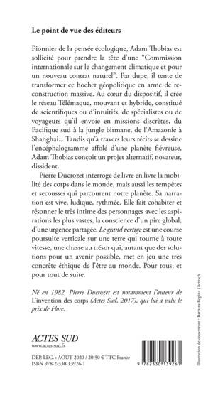Pierre Ducrozet interroge de livre en livre la mobilité des corps dans le monde, mais aussi les tempêtes et secousses qui parcourent notre planète. Sa narration est vive, ludique, rythmée. Elle fait cohabiter et résonner le très intime des personnages avec les aspirations les plus vastes, la conscience d'un pire global, d'une urgence partagée. «Le grand vertige» est une course poursuite verticale sur une terre qui tourne à toute vitesse, une chasse au trésor qui, autant que des solutions pour un avenir possible, met en jeu une très concrète éthique de l'être au monde. Pour tous, et pour tout de suite.