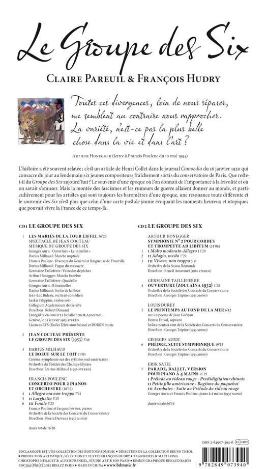 Une brève histoire du Groupe des Six, ainsi nommé par Jean Cocteau, racontée par François Hudry, illustrée par Claire Pareuil, accompagnée de 2 compact discs.<br /> L'histoire a été souvent relatée; c'est un article de Henri Collet dans le journal Comoedia du 16 janvier 1920 qui consacre du jour au lendemain six jeunes compositeurs fraîchement sortis du conservatoire de Paris. Que reste-t-il du Groupe des Six aujourd'hui ? Le souvenir d'une époque où l'on donnait de l'importance à la frivolité et où on savait s'amuser. Mais la montée des fascismes et les rumeurs de guerre allaient donner au monde, et particulièrement pour les artistes qui sont toujours les baromètres d'une époque, une résonance toute différente et le souvenir des Six n'est plus que celui d'une carte postale jaunie évoquant les moments heureux et utopiques que pouvait vivre la France de ce temps là.<br /><br /> CD 1 (76'10)<br /><br /> 1 Les Mariés de la Tour Eiffel 36'25<br /> Spectacle de Jean Cocteau - Musique du Groupe des Six<br /> Georges Auric : Ouverture "Le 14 juillet"<br /> Darius Milhaud : Marche nuptiale<br /> Francis Poulenc : Discours du Général et Baigneuse de Trouville<br /> Darius Milhaud : Fugue du massacre<br /> Germaine Tailleferre : Valse des dépêches<br /> Arthur Honegger : Marche funèbre<br /> Germaine Tailleferre : Quadrille<br /> Georges Auric : Ritournelles<br /> Darius Milhaud : Sortie de la Noce<br /> Récitant-comédien : Jean-Luc Bideau<br /> Violon solo : Saskia Filippini<br /> Collegium Academicum de Genève<br /> Direction : Robert Dunand<br /> [Enregistré en concert à la Salle Ernest-Ansermet, Genève, le 31 janvier 1983 STEREO]<br /> Licences RTS (Radio Télévision Suisse) et DORON music<br /><br /> 2 Jean Cocteau présente le Groupe des Six (1953) 5'48<br /><br /> 3 Darius Milhaud<br /> Le Boeuf sur le toit, 15'05<br /> cinéma-symphonie sur des rythmes sud-américains<br /> Orchestre du Théâtre des Champs-Elysées<br /> Direction : Darius Milhaud (1956 STEREO)<br /><br /> 4 - 6 Francis Poulenc <br /> Concerto pour 2 pianos et orchestre 18'32<br /> 4 I. Allegro ma non troppo 7'41<br /> 5 II. Larghetto 5'25<br /> 6 III. Finale 5'25<br /> Francis Poulenc & Jacques Février, pianos<br /> Orchestre de la Société des Concerts du Conservatoire <br /> Direction : Pierre Dervaux (1957 MONO)<br /><br /><br /><br /><br /><br /> CD 2 (66'44)<br /><br /> Arthur Honegger<br /> 1 - 3 Symphonie no 2 pour cordes et trompette ad libitum 24'06<br /> 1 I. Molto moderato-Allegro 11'29<br /> 2 II. Adagio, mesto 7'29<br /> 3 III. Vivace, non troppo 5'11<br /> Orchestre de la Suisse Romande<br /> Direction : Ernest Ansermet (1961 STEREO)<br /><br /> Germaine Tailleferre<br /> 4 Ouverture (Zoulaïna 1932) 4'28<br /> Orchestre de la Société des Concerts du Conservatoire<br /> Direction : Georges Tzipine (1953 MONO)<br /><br /> Louis Durey<br /> 5 Le Printemps au fond de la mer, 6'42<br /> sur un poème de Jean Cocteau<br /> Denise Duval, soprano<br /> Instruments à vent de la Société des Concerts du Conservatoire<br /> Direction : Georges Tzipine (1953 MONO)<br /><br /> Georges Auric<br /> 6 Phèdre, suite symphonique 19'43<br /> Orchestre de la Société des Concerts du Conservatoire<br /> Direction : Georges Tzipine (1953 MONO)<br /><br /> Erik Satie<br /> 7 Parade, ballet, version pour piano à 4 mains 11'19<br /> I. Prélude au rideau rouge - Prestidigitateur chinois<br /> II. Petite fille américaine - Ragtime du paquebot<br /> III. Acrobates - Suite au Prélude du rideau rouge<br /> Georges Auric & Francis Poulenc, piano à 4 mains (1937 MONO)<br /><br /><br />