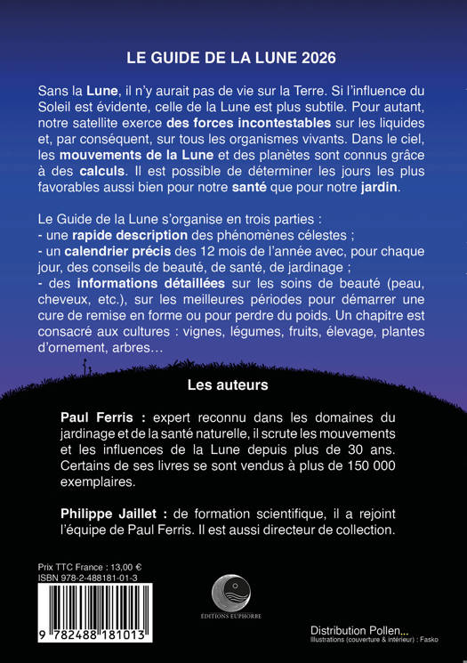 Sans la Lune, il n’y aurait pas de vie sur la Terre. Si l’influence du Soleil est évidente, celle de la Lune est plus subtile. Pour autant, notre satellite exerce des forces incontestables sur les liquides et, par conséquent, sur tous les organismes vivants. Dans le ciel, les mouvements de la Lune et des planètes sont connus grâce à des calculs. Il est possible de déterminer les jours les plus favorables aussi bien pour notre santé que pour notre jardin. Le Guide de la Lune s’organise en trois parties : - une rapide description des phénomènes célestes ; - un calendrier précis des 12 mois de l’année avec, pour chaque jour, des conseils de beauté, de santé, de jardinage ; - des informations détaillées sur les soins de beauté (peau, cheveux, etc.), sur les meilleures périodes pour démarrer une cure de remise en forme ou pour perdre du poids. Un chapitre est consacré aux cultures : vignes, légumes, fruits, élevage, plantes d’ornement, arbres...