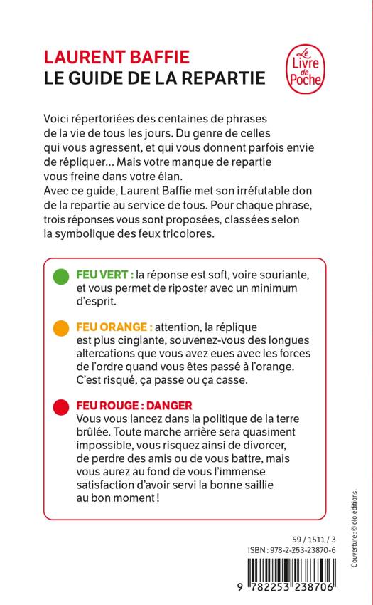 Voici répertoriées des centaines de phrases de la vie de tous les jours. Ce genre de phrases qui vous agressent, et qui vous donnent parfois envie d’agresser l’autre… Mais votre manque de repartie vous freine dans votre élan. Avec ce guide, Laurent Baffie met son don irréfutable de la repartie au service de tous.