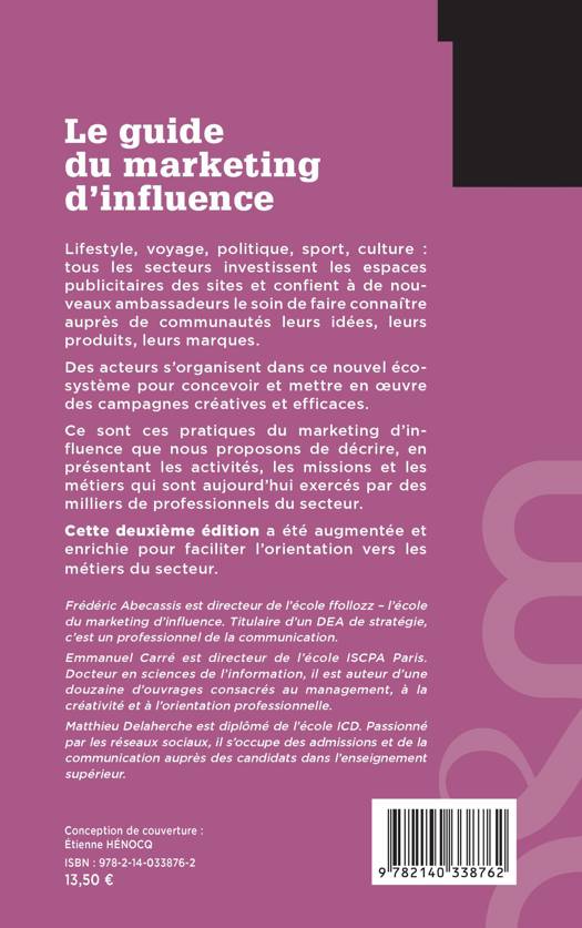 Lifestyle, voyage, politique, sport, culture : tous les secteurs investissent les espaces publicitaires des sites et confient à de nouveaux ambassadeurs le soin de faire connaître auprès de communautés leurs idées, leurs produits, leurs marques. Des acteurs s'organisent dans ce nouvel écosystème pour concevoir et mettre en uvre des campagnes créatives et efficaces. Ce sont ces pratiques du marketing d'influence que nous proposons de décrire, en présentant les activités, les missions et les métiers qui sont aujourd'hui exercés par des milliers de professionnels du secteur. Cette deuxième édition a été augmentée et enrichie pour faciliter l'orientation vers les métiers du secteur.