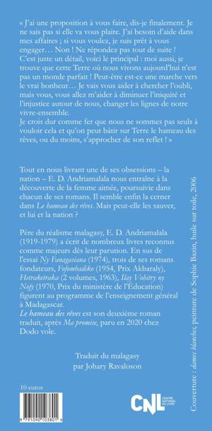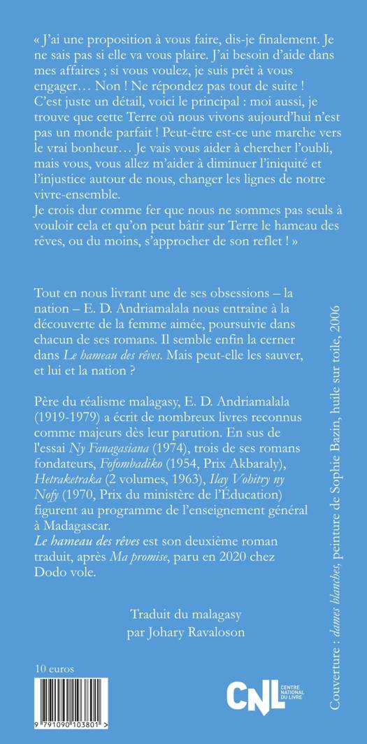 Tout en nous livrant une de ses obsessions – la nation – E. D. Andriamalala nous entraîne à la découverte de la femme aimée, poursuivie chacun dans chacun de ses romans. Il semble enfin la cerner dans Le hameau des rêves. Mais peut-elle les sauver, et lui et la nation ?