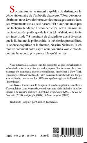 Sommes-nous vraiment capables de distinguer le genie visionnaire de l'imbecile chanceux ? Pourquoi nous obstinons-nous a vouloir trouver des messages senses dans des evenements dus au seul hasard ? Et n'aurions-nous pas une facheuse tendance a ordonner le reel selon une routine mentale biaisee, plutot que de le voir tel qu'il est, avec toute son incertitude ? S'inspirant de disciplines aussi diverses que la litterature, la philosophie, la theorie des probabilites, la science cognitive et la finance, Nassim Nicholas Taleb montre comment notre esprit nous conduit a voir le monde comme beaucoup plus previsible qu'il ne l'est...
