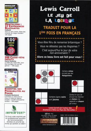 Ce livre est plus qu’un livre. C’est aussi un jeu ! Il est fourni avec des éléments à découper dans le rabat. Lewis Carroll, l’auteur d’''Alice au pays des Merveilles'', était aussi un logisticien de haute volée. Et quand on pousse la logique dans ses derniers retranchements, on arrive à des illogismes grandioses. C’est ce que nous invite à faire ce jeu un peu fou, comme “Le lion, dont n’importe qui peut dire qu’il l’a traqué autant que moi, est un animal très sauvage ; et certains individus parmi les lions ne boivent pas de café, bien que je ne garantirai pas que cette loi s’applique à tous les lions.” Un exemple parmi tant d’autres ! En expliquant son jeu, l’auteur rappelle les règles de base de la logique en utilisant des animaux et des situations cocasses. Un livre unique en son genre et très distrayant, traduit par François Montmirel, un spécialiste passionné. Inédit en français sous sa forme intégrale.