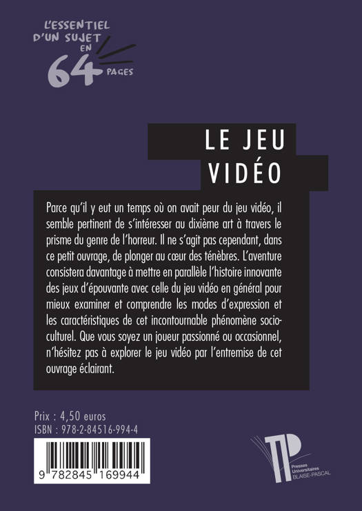 Parce qu'il y eut un temps où on avait peur du jeu vidéo, il semble pertinent de s'intéresser au dixième art à travers le prisme du genre de l’horreur. Il ne s’agit pas cependant, dans ce petit ouvrage, de plonger au cœur des ténèbres. L’aventure consistera davantage à mettre en parallèle l’histoire innovante des jeux d’épouvante avec celle du jeu vidéo en général pour mieux examiner et comprendre les modes d’expression et les caractéristiques de cet incontournable phénomène socioculturel. Que vous soyez un joueur passionné ou occasionnel, n’hésitez pas à explorer le jeu vidéo par l’entremise de cet ouvrage éclairant.