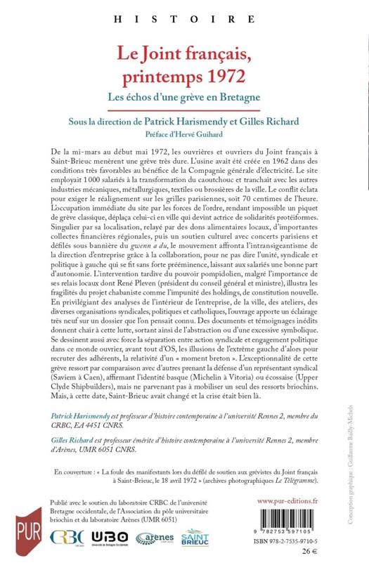 De la mi-mars au début mai 1972, les ouvrières et ouvriers du Joint français à Saint-Brieuc menèrent une grève très dure. L’usine avait été créée en 1962 dans des conditions très favorables au bénéfice de la Compagnie générale d’électricité. Le site employait 1 000 salariés à la transformation du caoutchouc et tranchait avec les autres industries mécaniques, métallurgiques, textiles ou brossières de la ville. Le conflit éclata pour exiger le réalignement sur les grilles parisiennes, soit 70 centimes de l’heure. L’occupation immédiate du site par les forces de l’ordre, rendant impossible un piquet de grève classique, déplaça celui-ci en ville qui devint actrice de solidarités protéiformes. Singulier par sa localisation, relayé par des dons alimentaires locaux, d’importantes collectes financières régionales, puis un soutien culturel avec concerts parisiens et défilés sous bannière du gwenn a du, le mouvement affronta l’intransigeantisme de la direction d’entreprise grâce à la collaboration, pour ne pas dire l’unité, syndicale et politique à gauche qui se fit sans forte prééminence, laissant aux salariés une bonne part d’autonomie. L’intervention tardive du pouvoir pompidolien, malgré l’importance de ses relais locaux dont René Pleven (président du conseil général et ministre), illustra les fragilités du projet chabaniste comme l’impunité des holdings, de constitution nouvelle. En privilégiant des analyses de l’intérieur de l’entreprise, de la ville, des ateliers, des diverses organisations syndicales, politiques et catholiques, l’ouvrage apporte un éclairage très neuf sur un dossier que l’on pensait connu. Des documents et témoignages inédits donnent chair à cette lutte, sortant ainsi de l’abstraction ou d’une excessive symbolique. Se dessinent aussi avec force la séparation entre action syndicale et engagement politique dans ce monde ouvrier, avant tout d’OS, les illusions de l’extrême gauche d’alors pour recruter des adhérents, la relativité d’un « moment breton ». L’exceptionnalité de cette grève ressort par comparaison avec d’autres prenant la défense d’un représentant syndical (Saviem à Caen), affirmant l’identité basque (Michelin à Vitoria) ou écossaise (Upper Clyde Shipbuilders), mais ne parvenant pas à mobiliser un seul des ressorts briochins. Mais, à cette date, Saint-Brieuc avait changé et la crise était bien là.