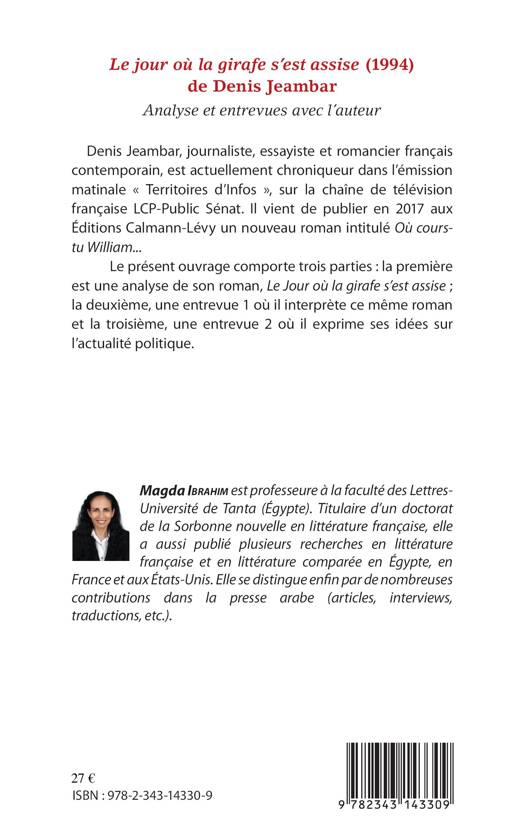 Denis Jeambar, journaliste, essayiste et romancier français contemporain, est actuellement chroniqueur dans l'émission matinale « Territoires d'Infos », sur la chaîne de télévision LCP-Public Sénat. La première partie est une analyse de son roman, Le Jour où la girafe s'est assise ; la deuxième, une entrevue où il interprète ce même roman et la troisième, une entrevue où il exprime ses idées sur l'actualité politique.