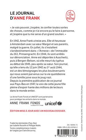 Anne Frank est née le 12 juin 1929 à Francfort. Sa famille a émigré aux Pays-Bas en 1933. À Amsterdam, elle connaît une enfance heureuse jusqu’en 1942, malgré la guerre. Le 6 juillet 1942, les Frank s’installent clandestinement dans «l’Annexe» de l’immeuble du 263, Prinsengracht. Le 4 août 1944, ils sont arrêtés sur dénonciation. Déportée à Auschwitz, puis à Bergen-Belsen, Anne meurt du typhus en février ou mars 1945, peu après sa sœur Margot. La jeune fille a tenu son journal du 12 juin 1942 au 1er août 1944, et son témoignage, connu dans le monde entier, reste l’un des plus émouvants sur la vie quotidienne d’une famille juive sous le joug nazi. Cette édition comporte des pages inédites.