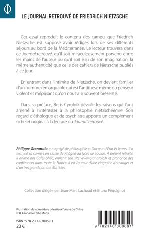 Cet essai reproduit le contenu des carnets que Friedrich Nietzsche est supposé avoir rédigés lors de ses différents séjours au bord de la Méditerranée. Le lecteur trouvera dans ce Journal retrouvé, qu'il soit miraculeusement parvenu entre les mains de l'auteur ou qu'il soit issu de son imagination, la même authenticité que celle des cahiers de Nietzsche publiés à ce jour. En entrant dans l'intimité de Nietzsche, on devient familier d'un homme remarquable qui est l'antithèse même du penseur violent et méprisant qu'on nous a si souvent présenté. Dans sa préface, Boris Cyrulnik dévoile les raisons qui l'ont amené à s'intéresser à la philosophie nietzschéenne. Son regard d'éthologue et de psychiatre apporte un complément riche et original à la lecture du Journal retrouvé.