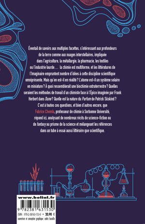Éventail de savoirs aux multiples facettes, s’intéressant aux profondeurs de la terre comme aux nuages interstellaires, impliquée dans l’agriculture, la métallurgie, la pharmacie, les textiles ou l’industrie lourde… la chimie est multiforme, et les littératures de l’Imaginaire empruntent nombre d’idées à cette discipline scientifique omniprésente. Mais qu’en est-il en réalité ? L’atome est-il un système solaire en miniature ? À quoi ressemblerait une biochimie extraterrestre ? Quelles seraient les méthodes de travail d’un chimiste face à l’Épice imaginée par Frank Herbert dans Dune ? Quelle est la nature du Parfum de Patrick Süskind ?