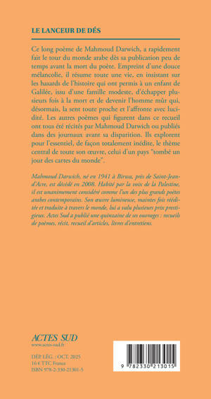 Ce long poème de Mahmoud Darwich, a rapidement fait le tour du monde arabe dès sa publication peu de temps avant la mort du poète. Empreint d'une douce mélancolie, il résume toute une vie, en insistant sur les hasards de l'histoire qui ont permis à un enfant de Galilée, issu d'une famille modeste, d'échapper plusieurs fois à la mort et de devenir l'homme mûr qui, désormais, la sent toute proche et l'affronte avec lucidité. Les autres poèmes qui figurent dans ce recueil ont tous été récités par Mahmoud Darwich ou publiés dans des journaux avant sa disparition. Ils explorent pour l'essentiel, de façon totalement inédite, le thème central de toute son oeuvre, celui d'un pays "tombé un jour des cartes du monde".