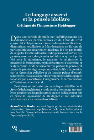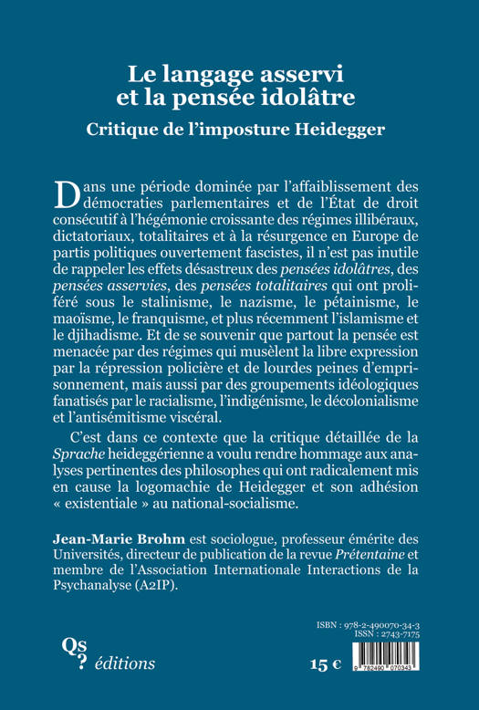 Dans une période dominée par l’affaiblissement des démocraties parlementaires et de l’État de droit consécutif à l’hégémonie croissante des régimes illibéraux, dictatoriaux, totalitaires et à la résurgence en Europe de partis politiques ouvertement fascistes, il n’est pas inutile de rappeler les effets désastreux des pensées idolâtres, des pensées asservies, des pensées totalitaires qui ont proliféré sous le stalinisme, le nazisme, le pétainisme, le maoïsme, le franquisme, et plus récemment l’islamisme et le djihadisme. Et de se souvenir que partout la pensée est menacée par des régimes qui musèlent la libre expression par la répression policière et de lourdes peines d’emprisonnement, mais aussi par des groupements idéologiques fanatisés par le racialisme, l’indigénisme, le décolonialisme et l’antisémitisme viscéral. C’est dans ce contexte que la critique détaillée de la Sprache heideggérienne a voulu rendre hommage aux analyses pertinentes des philosophes qui ont radicalement mis en cause la logomachie de Heidegger et son adhésion “existentiale” au national-socialisme.