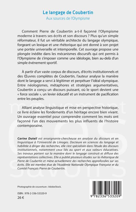 Comment Pierre de Coubertin a-t-il façonné l'Olympisme moderne à travers ses écrits et son discours ? Plus qu'un simple réformateur, il fut un véritable architecte du langage olympique, forgeant un lexique et une rhétorique qui ont donné à son projet une portée universelle et intemporelle. Cet ouvrage propose une plongée inédite dans les mécanismes discursifs qui ont permis à l'Olympisme de s'imposer comme une idéologie, bien au-delà d'un simple événement sportif. À partir d'un vaste corpus de discours, d'écrits institutionnels et des OEuvres complètes de Coubertin, l'auteur analyse la manière dont le langage a servi à légitimer et perpétuer l'idéal olympique. Entre néologismes, métaphores et stratégies argumentatives, Coubertin a conçu un discours puissant, où le sport devient une force sociale, un levier éducatif et un instrument de pacification entre les peuples. Alliant analyse linguistique et mise en perspective historique, ce livre éclaire les fondements d'un héritage encore bien vivant. Un ouvrage essentiel pour comprendre comment les mots ont façonné l'un des mouvements les plus influents de l'histoire contemporaine.
