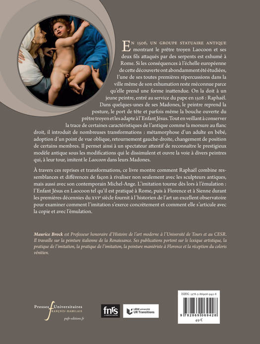 En 1506, un groupe statuaire antique montrant le prêtre troyen Laocoon et ses deux fils attaqués par des serpents est exhumé à Rome. Si les conséquences à l’échelle européenne de cette découverte ont abondamment été étudiées, l’une de ses toutes premières répercussions dans la ville même de son exhumation reste méconnue parce qu’elle prend une forme inattendue. On la doit à un jeune peintre, entré au service du pape en 1508 : Raphaël. Dans quelques-unes de ses Madones, le peintre reprend la posture, le port de tête et parfois même la bouche ouverte du prêtre troyen et les adapte à l’Enfant Jésus. Tout en veillant à conserver la trace de certaines caractéristiques de l’antique comme la morsure au flanc droit, il introduit de nombreuses transformations : métamorphose d’un adulte en bébé, adoption d’un point de vue oblique, retournement gauche-droite, changement de position de certains membres. Il permet ainsi à un spectateur attentif de reconnaître le prestigieux modèle antique sous les modifications qui le dissimulent et ouvre la voie à divers peintres qui, à leur tour, imitent le Laocoon dans leurs Madones. À travers ces reprises et transformations, ce livre montre comment Raphaël combine ressemblances et différences de façon à rivaliser non seulement avec les sculpteurs antiques, mais aussi avec son contemporain Michel-Ange. L’imitation tourne dès lors à l’émulation : l’Enfant Jésus en Laocoon tel qu’il est pratiqué à Rome, puis à Florence et à Sienne durant les premières décennies du XVIe siècle fournit à l’historien de l’art un excellent observatoire pour examiner comment l’imitation s’exerce concrètement et comment elle s’articule avec la copie et avec l’émulation.