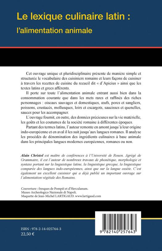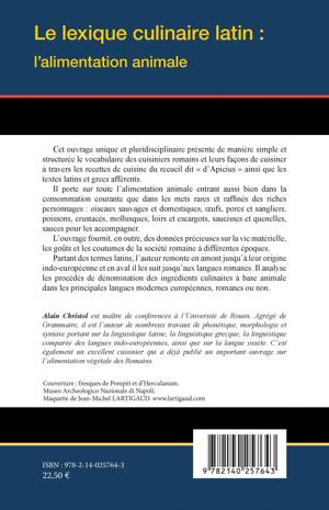 Cet ouvrage unique et pluridisciplinaire présente de manière simple et structurée le vocabulaire des cuisiniers romains et leurs façons de cuisiner à travers les recettes de cuisine du recueil dit d'Apicius ainsi que les textes latins et grecs afférents. Il porte sur toute l'alimentation animale entrant aussi bien dans la consommation courante que dans les mets rares et raffinés des riches personnages: oiseaux sauvages et domestiques, oeufs, porcs et sangliers, poissons, crustacés, mollusques, loirs et escargots, saucisses et quenelles, sauces pour les accompagner. L'ouvrage fournit, en outre, des données précieuses sur la vie matérielle, les goûts et les coutumes de la société romaine à différentes époques. Partant des termes latins, l'auteur remonte en amont jusqu'à leur origine indo-européenne et en aval il les suit jusqu'aux langues romanes. Il analyse les procédés de dénomination des ingrédients culinaires à base animale dans les principales langues modernes européennes, romanes ou non.