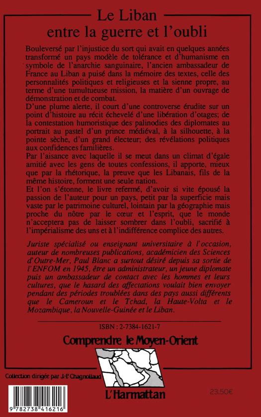 Bouleversé par I 'injustice du sort qui avait en quelques années transformé un pays modèle de tolérance et d'humanisme en symbole de l'anarchie sanguinaire. l'ancien ambassadeur de France au Liban a puisé dans la mémoire des textes, celle des personnalités politiques et religieuses et la sienne propre, au terme d'une tumultueuse mission, la matière d'un ouvrage de démonstration et de combat. D'une plume alerte, il court d'une controverse érudite sur un point d'histoire au récit échevelé d'une libération d'otages; de la contestation humoristique des• palinodies des diplomates au portrait au pastel d'un prince redévala, à la silhouette, à la pointe sèche, d'un grand électeur; des révélations politiques aux confidences familières. Par l'aisance avec laquelle il se meut dans un climat d'égale amitié avec les gens de toutes confessions, il apporte, mieux que par la rhétorique. la preuve que les Libanais, fils de la même histoire, forment une seule nation. Et l'on s'étonne, le livre refermé, d'avoir si vite épousé la passion de l'auteur pour un pays, petit par la superficie mais vaste par le patrimoine culturel, lointain par la géographie mais proche du nôtre par le cœur et l'esprit, que le monde n'acceptera pas de laisser sombrer dans l'oubli, sacrifié à I 'impérialisme des uns et à I 'indifférence complice des autres. Juriste spécialisé ou enseignant universitaire à l'occasion, auteur de nombreuses publications, académicien des Sciences d'Outre-Mer, Paul Blanc a surtout désiré depuis sa sortie de I' ENFOM en 1945, être un administrateur, un jeune diplomate puis un ambassadeur de contact avec les hommes et leurs cultures, que le hasard des affectations voulait bien envoyer pendant des périodes troublées dans des pays aussi différents que le Cameroun et le Tchad, la Haute-Volta et le Mozambique, la Nouvelle-Guinée et le Liban.