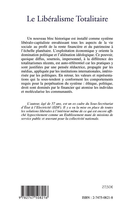 Un nouveau bloc historique est installé comme système libéralo-capitaliste envahissant tous les aspects de la vie sociales au profit de la rente financière et du patrimoine à l'échelle planétaire. L'exploitation économique y oriente la domination politique et l'aliénation idéologique. Ce pouvoir quoique diffus, sournois, impersonnel, à la différence des totalitarismes récents, est auto-référentiel car les pratiques y sont justifiées par une pensée réductrice, propagée par les médias, appliquée par les institutions internationales, intériorisée par les politiques.