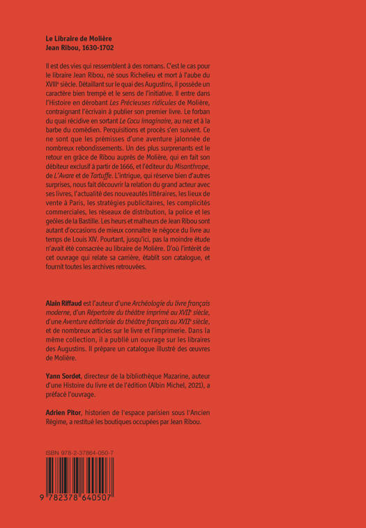 Il est des vies qui ressemblent à des romans. C’est le cas pour le libraire Jean Ribou, né sous Richelieu et mort à l’aube du XVIIIe siècle. Détaillant sur le quai des Augustins, il possède un caractère bien trempé et le sens de l’initiative. Il entre dans l’Histoire en dérobant Les Précieuses ridicules de Molière, contraignant l’écrivain à publier son premier livre. Le forban du quai récidive en sortant Le Cocu imaginaire, au nez et à la barbe du comédien. Perquisitions et procès s’ensuivent. Ce ne sont que les prémices d’une aventure jalonnée de nombreux rebondissements. Un des plus surprenants est le retour en grâce de Ribou auprès de Molière, qui en fait son éditeur exclusif à partir de 1666, avec Le Misanthrope, L’Avare et Le Tartuffe. L’intrigue, qui réserve bien d’autres surprises, nous fait découvrir la relation du grand acteur avec ses livres, l’actualité des nouveautés littéraires, les lieux de vente à Paris, les stratégies publicitaires, les complicités commerciales, les réseaux de distribution, la police et les geôles de la Bastille. Les heurs et malheurs de Jean Ribou sont autant d’occasions de mieux connaître le négoce du livre au temps de Louis XIV. Pourtant, jusqu’ici, pas la moindre étude n’avait été consacrée au libraire de Molière. D’où l’intérêt de cet ouvrage qui relate sa carrière, établit son catalogue, et fournit toutes les archives retrouvées.