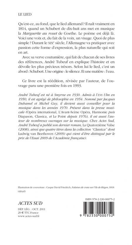 Qu'est-ce, au fond que le Lied allemand ? Le lied allemand naît vraiment en 1814, quand un Schubert de dix-huit ans met en musique la «Marguerite au rouet» de Goethe. Durant le XIXe siècle, l'Allemagne va pratiquer avec passion cette forme d'expression, la plus naturelle qui soit en art. Avec sa verve coutumière, qui font de chacun de ses livres des références, André Tubeuf en explique l'histoire et en dévoile les plus précieux trésors. Selon lui le Lied, c'est un abord : Schubert. Une origine : le silence. Et une matière : l'eau. Ce livre est la réédition, révisée par l'auteur, de l'ouvrage paru une première fois en 1993.