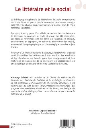 Cette bibliographie générale compte près de 2000 titres. Les travaux référencés ont été écrits en français, en anglais, en allemand, espagnol, italien, néerlandais, sans restriction géographique ou chronologique dans les sujets traités. Pourvu d'un index des noms d'auteurs, Le littéraire et le social rend disponibles les références à tout ce dont les étudiants et chercheurs ont besoin en recherche, en sociologie de la littérature, en sociocritique, en sociopoétique ou encore en histoire sociale du littéraire.